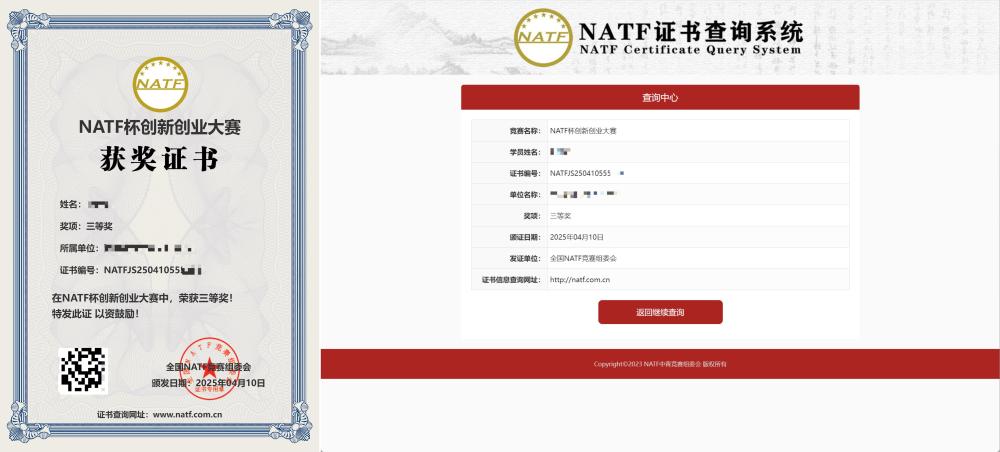 记者向“NATF学术顾问”咨询相关竞赛证书时被告知,只需缴纳280/200/120元,无需参赛,便可直接获得所有“竞赛”的一、二、三等奖证书,而且“官网可查”。而其所谓的“官网”则是“NATF标准化职业技能考试认证职业技能证书查询平台”网站。