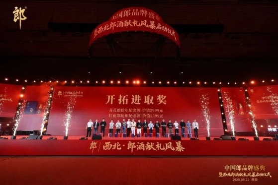 除汽车特等奖外,活动还为现场嘉宾准备了青花郎、红花郎等丰厚礼品,设置10名一等奖、20名二等奖及30名郎牌特曲相关奖项,掌声与欢呼声贯穿全程。为回馈合作伙伴长期以来的支持,仪式特别为15位优秀终端颁发“开拓进取奖”,奖品包括价值2999元的青花郎蛇年纪念酒与1399元的红花郎蛇年纪念酒,以表彰其对郎酒西北市场发展的突出贡献。
