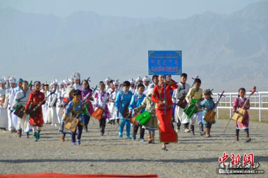 7月26日上午,甘肃肃北蒙古族自治县第五届那达慕民族文化风情旅游节开幕。开幕式上,马头琴呼麦方队、民族服饰方队、搏克方队等8个表演方队展现了蒙古族草原文化的魅力。此次节会期间,将开展赛马、赛驼、射箭、搏克等蒙古民族传统体育竞赛活动。图为马头琴呼麦方队。