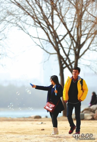 3月3日,两位年轻人在沙尘弥漫的河边散步。首席记者马军实习生陈立稳摄