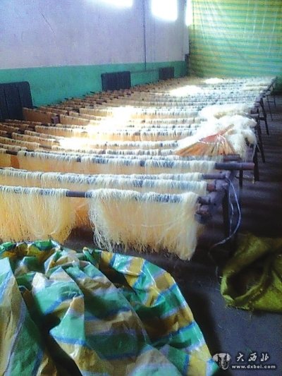 大西北网3月26日讯 在铁架的支撑下,竹板成斜角立着,竹板上面晒满了加工好的米线,看上去白茫茫的一片,一群麻雀叽叽喳喳的叫嚷着,不时地落在米线上享“美食”;原料库里堆放着几百袋大米,米袋上和散落在地上的大米中,老鼠屎随处可见;成品库内肮脏的架子上满满的也是米线,有些扎成把子的米线直接置于地上……昨日,兰州市城关区食品药品稽查局联合东岗食品药品监督管理所,依法将该未经许可的米线非法加工点依法查处。