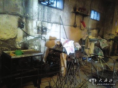 随后在加工间,记者看到,这是一线式的加工程序:前面一间房子里,一个浸泡池两台磨浆机,浸泡池里面浸泡着大米,边沿上是发黄的污垢,里面放着一把铁锹,用来抄米,磨浆机也已被污垢锈住。在中间一间房子里,摆放着四台加工米线的设备,其中两台正在使用,但都是肮脏不堪,用来遮盖的塑料帘子,脏得已经发黑。最后一间房屋则是包装间,摆放着两台包装机,6个破烂的木架子,环境非常简陋。