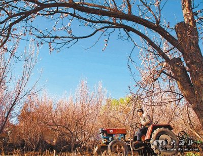 近日,甘肃省敦煌市月牙泉镇月牙泉村的农民在李广杏园中犁地。清明时节,敦煌月牙泉镇的千亩杏花竞相开放,当地农民抢抓农时忙春耕。