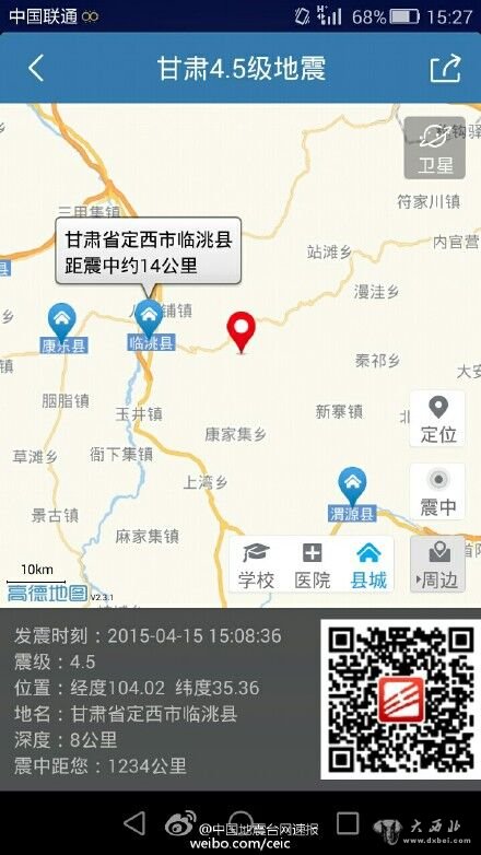 大西北网讯 据中国地震台网消息:4月15日15时08分在甘肃省定西市临洮县(北纬35.4度,东经104.0度)发生4.5级地震,震源深度9千米。另据网友提供,地震发生时,西宁、定西、兰州、临夏等地震感明显。据临洮宣传部门消息,当地东山、西山有局部地方出现滑坡,部分土坯房受到影响,其他具体情况还在统计中。