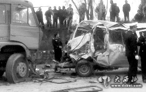2011年11月16日,发生在庆阳市正宁县榆林子镇的幼儿园校车事故现场。资料图片