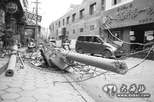 23日上午11时许,记者来到现场看到,七里河小西湖西街靠近体育街巷道口,一根水泥钢筋的高压电杆已被撞断为三截,横在一家临街店铺门前,前方四五米外一根木质电线杆也被撞断倒地,电缆线散落一地。前方巷道口电信局抢修工作人员正在抢修线路。据临街商户介绍,凌晨2时许,突然听到外面发生撞击的巨响声,出去发现夜色中一辆红色的大货车撞断电杆后逃离现场,当时也没记住车号。约凌晨3时许,再次听到撞击声,后面驶来的车辆又撞上了电线杆,并导致高压线发生闪爆。天亮后,发现小西湖西街巷口一根高压电线杆和一根电缆线杆被撞断,体育街东侧临街商铺及周边住户停电,七里河区委家属院等小区住户网络瘫痪。