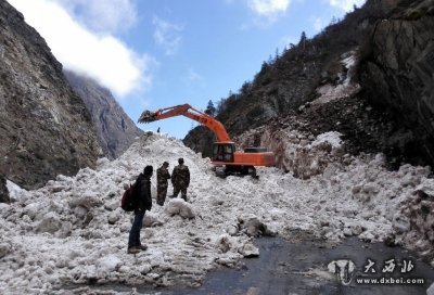 4月27日,大型设备全力抢修西藏日喀则市吉隆县城到热索桥44公里处雪崩影响路段。
