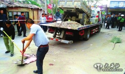 在路口向南约100多米的地方是一个三岔路口,这里便是事发现场。马路中央是三马子倾覆的一大堆鹅卵石,旁边是一大滩血迹。交警等相关部门工作人员已经在清理现场。肇事的三马子已经被装上拖车,三马子头部完全变形,断为两截。