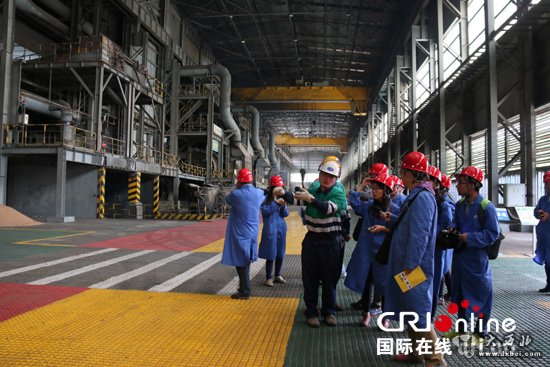 记者一行在金川公司顶吹炉车间进行采访,该车间每年利用回收的二氧化硫制成硫酸近70万吨