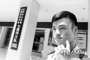 被打的协警张铁军脸部有一道伤口。