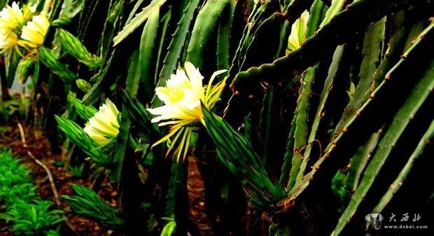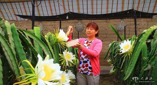 据了解,火龙果开花在5月—10月,晚上10点以后全部绽放,第二天清晨9点太阳出来以后就凋谢,是名副其实的“夜仙子”。三年以前,王海涛从南方引进火龙果在当地栽培,经过几年的精心培育,火龙果栽培成功并取得可观的经济效益,今年他又置了20座日光大棚全部栽培火龙果。(陈礼摄)