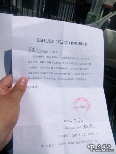 随后,八里镇副镇长宗璞、区教育局李副局长等相关人员,对花寨子村八里镇中心幼儿园、启蒙幼儿园等5家无证幼儿园下发了停办通知书,并告知负责人,在未取得幼儿园办园许可证(幼儿托护审批)手续之前,必须停办。对八里窑村牟家湾农家院作坊式的天恩无证托护点进行取缔,同时还将挂有幼儿园字样的启蒙等无证幼儿园摘牌。宗副镇长表示,启蒙幼儿园暂时将牌子遮挡住,明后天将督促摘除灯箱装饰的牌子。