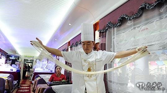 大西北网讯 10月1日,兰州至上海Z218次“兰州旅游号”品牌列车餐车上现场拉面表演吸引旅客。Z218/7次品牌列车是兰州铁路局精心打造的集西部文化、丝路文化和铁路文化为一体的高品质旅游列车,按照“新品味、新亮点、新感觉”理念,突出“乘‘兰州旅游号’列车,赏丝绸之路风情”的主题。