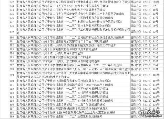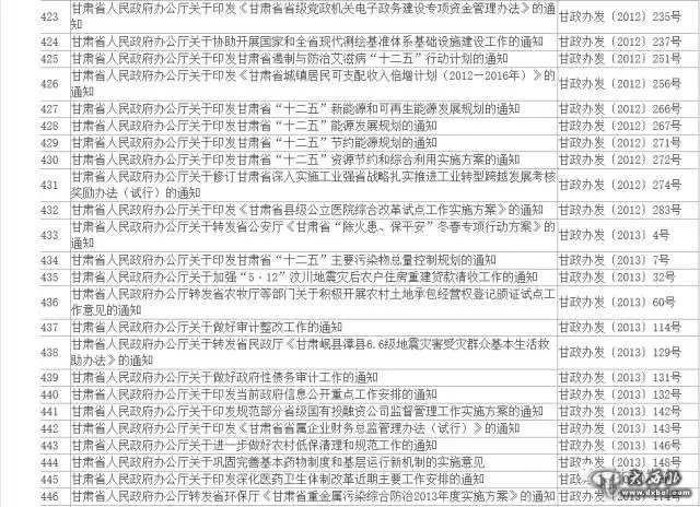 根据国务院相关要求,省政府对2000年1月1日至2015年12月31日期间的文件进行了全面清理。除22件涉密的文件之外,此次宣布失效的共计465件。其中包括:《甘肃省人民政府关于自行车电动自行车载人问题的通知》、《甘肃省人民政府关于加强流动人口计划生育工作的通知》、《甘肃省人民政府关于解决农民工问题的意见》、《甘肃省人民政府关于解决城市低收入群体家庭住房困难的意见》、《甘肃省人民政府关于实施全省农村特困群众危房改造工程的意见》、《甘肃省人民政府关于印发甘肃省城镇居民基本医疗保险实施方案的通知》、《甘肃省人民政府关于稳步实施廉租住房的意见》、《甘肃省人民政府办公厅关于印发甘肃省地震应急预案的通知》等。