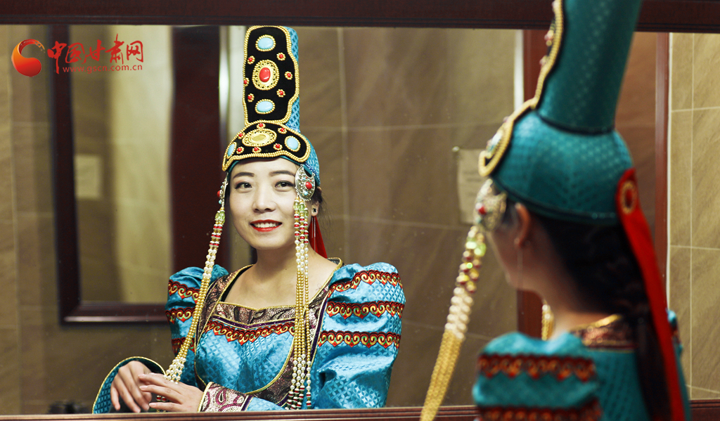 11月10日,张掖甘州区平山湖蒙古族乡蒙古族长调民歌非遗传承人比赛前选手在进行化妆。王将摄