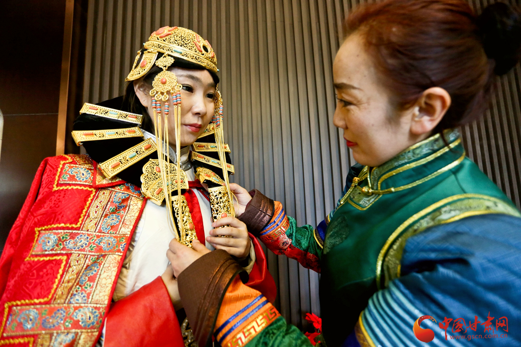 11月10日,张掖甘州区平山湖蒙古族乡蒙古族长调民歌非遗传承人比赛前选手们在互相整理服装。王将摄