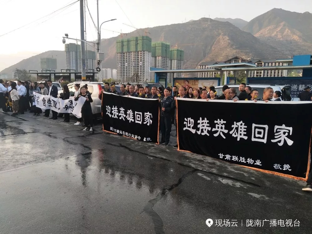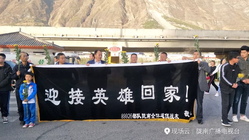 当灵车经过,早早等候的市民们,拉起横幅,告别英雄。“迎接英雄回家”、“感谢英雄用生命守护祖国山河”、“英雄一路走好”……无数横幅,寄托着家乡人民对英雄的敬意。
