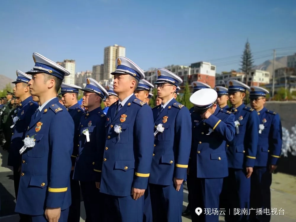 现场消防官兵挥泪为战友送别。