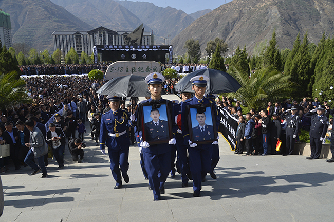 4月6日,在四川木里森林火灾扑救中英勇牺牲的烈士郭启、王佛军骨灰回到家乡甘肃陇南,受到家乡父老乡亲迎接。新华社发(冉创昌 摄)