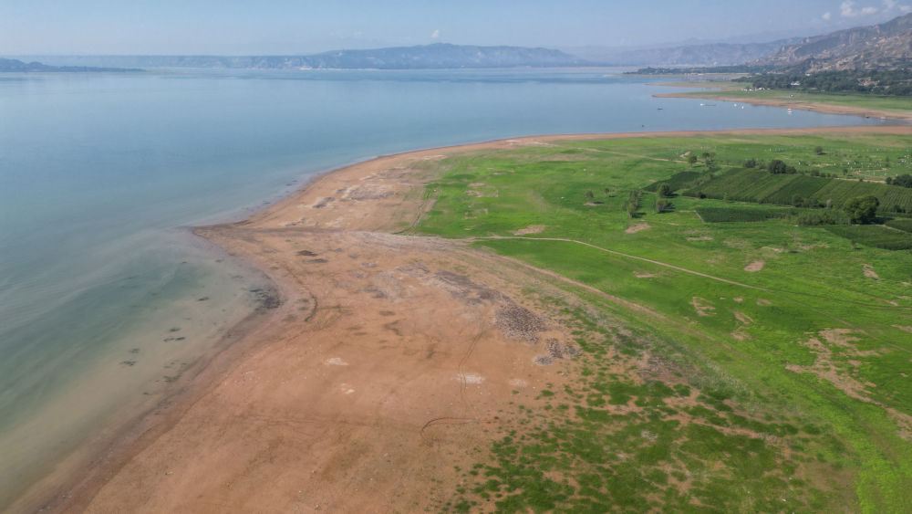 刘家峡水库水位下降,大片河滩裸露(7月24日摄,无人机照片)。新华社发(史有东摄)