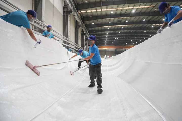 1月23日,在位于酒泉经济技术开发区的中材科技(酒泉)风电叶片有限公司,工作人员生产风机叶片。新华每日电讯记者 马希平 摄