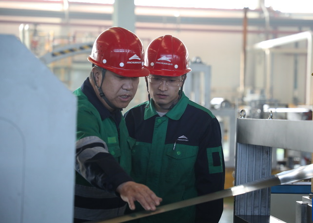 1月22日,在甘肃省金昌市金川集团镍合金有限公司内,两名工人正在进行讨论。新华社每日电讯记者 张睿 摄