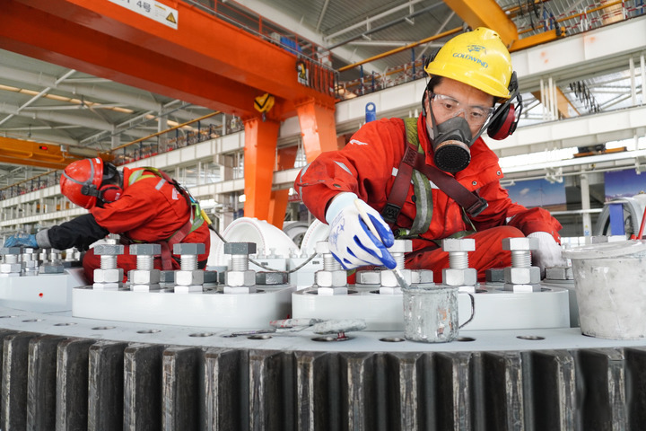 1月23日,在位于酒泉经济技术开发区的甘肃金风风电设备制造有限公司,工作人员进行风机总装。新华每日电讯记者 马希平 摄