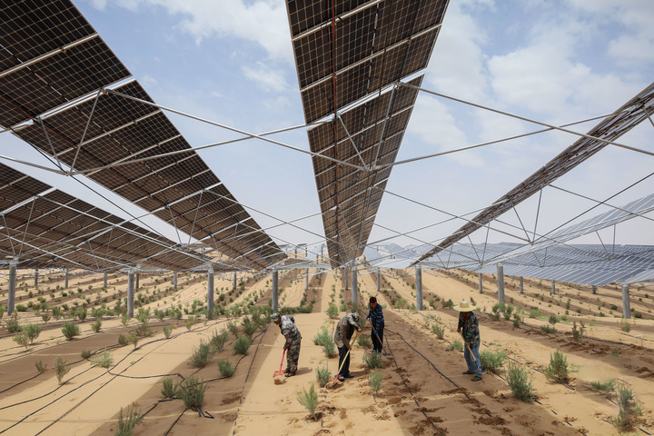 2023年6月1日,工人在武威市凉州区九墩滩光伏治沙示范园区管护喷灌管道。新华社每日电讯记者 马希平 摄