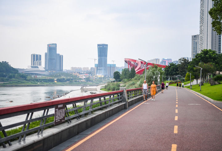 人们在四川省宜宾市三江口长江边的绿道上散步(2023年6月28日摄)。新华社记者王曦摄