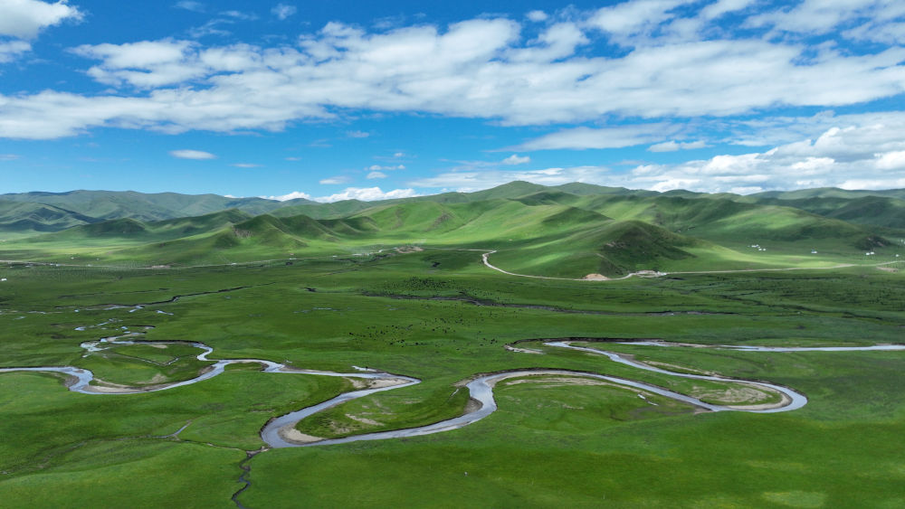 这是甘肃省甘南藏族自治州玛曲县阿万仓湿地景色(2023年7月6日摄,无人机照片)。新华社记者陈斌摄