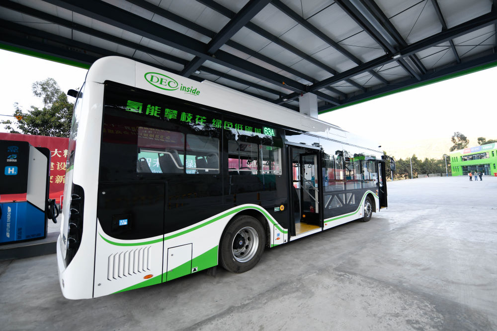 停靠在四川攀枝花加氢站的氢能公交车(2022年11月27日摄)。新华社记者胥冰洁摄