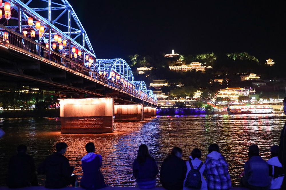 2024年10月4日晚,游客在黄河兰州段岸边欣赏黄河夜景。新华社记者郎兵兵摄