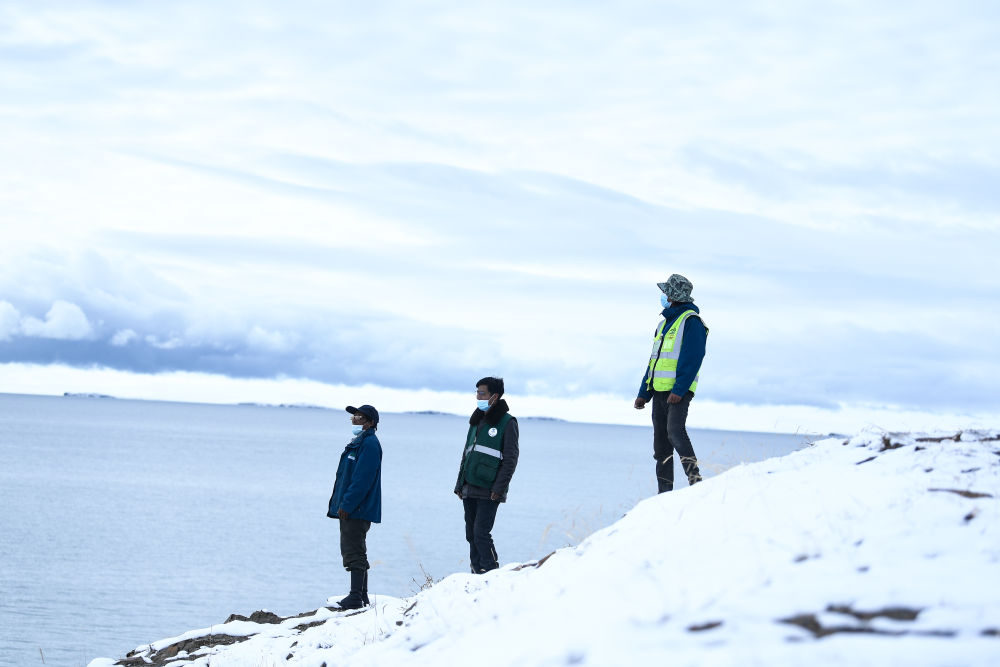2021年10月20日,在青海省果洛藏族自治州玛多县扎陵湖乡勒那村,三江源国家公园黄河源园区生态管护员在扎陵湖畔巡护。新华社记者李占轶摄