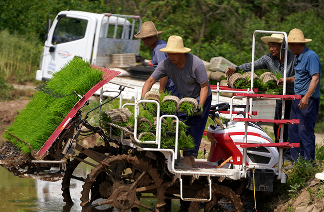 纵横交错的稻田里水光潋滟,波光荡漾,大地生机勃勃。只见插秧机来回穿梭在田间“大显身手”,不一会儿一株株嫩绿的秧苗从插秧机苗盘上滑落,稳稳地“站立”在水田里,原本光秃秃的水田很快披上了“绿装”,放眼望去,农民劳作的身影,与河流、民居、大山相互映衬,构成了一幅美丽的乡村田园画卷。