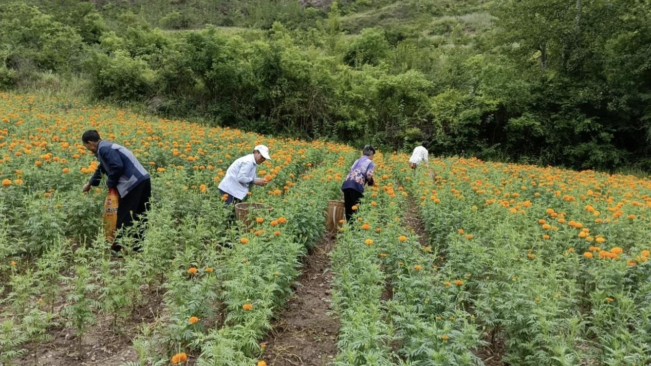 “党支部搭台、合作社唱戏、农户收益”,为了让产业落地见效,党支部牵头与万寿菊种植专业合作社签订协,一头连支部、一头连农户。