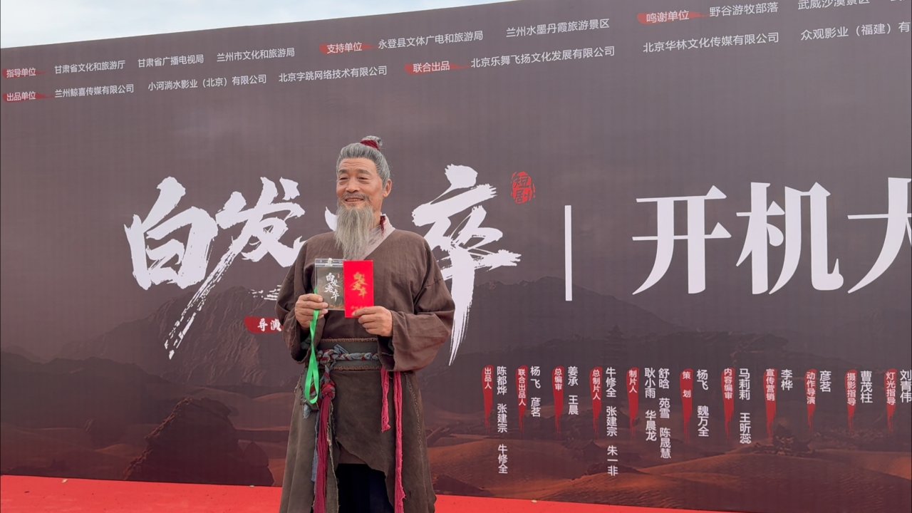 大西北网讯(记者王志俭文图)5月16日上午,由甘肃省文旅厅、甘肃省广播电视局、兰州市文旅局指导,兰州鲸喜传媒有限公司、小河淌水影业(北京)有限公司与北京字跳网络技术有限公司出品,“甘肃文旅推荐官”三喜爷爷张以芳、和青年实力派演员周宁嘉,宋禹等联合主演的横跨千年家国情怀网络短剧《白发老卒》,在兰州水墨丹霞旅游景区举行了开机仪式。