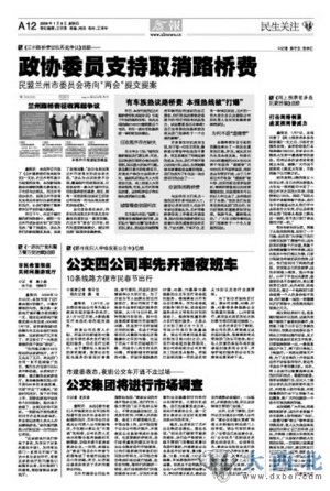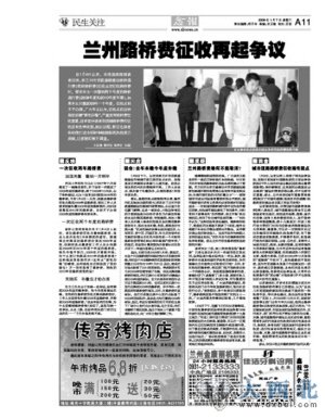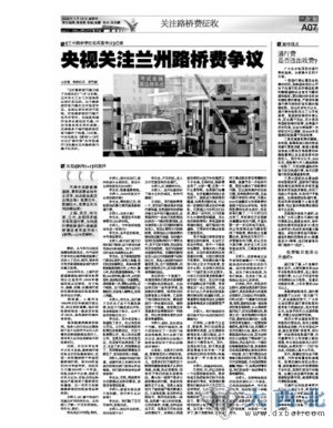 2009年1月7日,鑫报率先就读者关心的兰州征收路桥费再受争议的话题进行了报道,引起社会各界强烈反应,包括央视在内的中央及地方媒体也对此事进行了关注。早在2008年12月22日,国家财政部、发改委、交通运输部、监察部、审计署等五部委就联合下发了《关于取消公路养路费等六项收费通知》,决定自2009年1月1日起,全面取消公路养路费等六项收费。这个消息一经公布,立即引起了社会各界的广泛关注,兰州路桥费是否也在取消之列?随后,不到1个月时间,国家六部委又联合下发《关于全面清理涉及交通和车辆收费的通知》,其中明确规定,属于“乱收费”、“不合理收费”的项目一律要在3月20日前取消。“兰州路桥费征收以后是否合法?”兰州广大有车一族在心存疑虑的同时,还是抱着一线希望:“终于可以减轻经济负担了!事实上,现在路桥费是车主们最大的一笔开支!”然而,就在他们翘首以待时获悉,兰州路桥费将继续征收,而兰州市路桥收费管理处及市政府新闻发言人则对媒体表示,兰州市征收路桥费符合国家规定和法律规定,收费是为了还城建贷款,目前已经累计征收2亿元,以后还将继续征收,直至2028年。这让广大车主们觉得有些不可思议。老百姓关心的也是媒体关心的,鑫报对此事作了连续报道,引起省市两会代表和政协委员关注,认为路桥费不合理,呼吁尽快取消。
