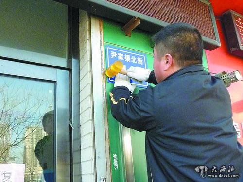 图为工作人员正在安装门牌。 本报记者 石永磊 摄