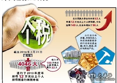 从职业分布来看,自行纳税申报人数较多的职业依次为金融、电力、制造、煤炭行业中层以上管理人员,改制企业股东,保险业高管,证券业经纪人,法律、经济等专业服务行业合伙人。