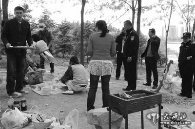 在亲水大街与银植路交会处的树林里,五六个年轻人支起帐篷,架好烧烤炉,已经开始惬意地品尝美味,地上因为烧烤产生的油渍糊了一大片,塑料袋、包装纸、烟头、蔬菜叶子等也扔得到处都是。记者注意到,多数烧烤市民自备垃圾袋,离开前将烧烤产生的竹扦子、废纸、饮料瓶等垃圾装袋。但是,也有“不讲究”的市民,吃喝完毕扬长而去,留下一堆堆垃圾。更有甚者,喝醉了酒,借着酒劲,将空酒瓶子摔碎取乐,给清理带来更大难题。