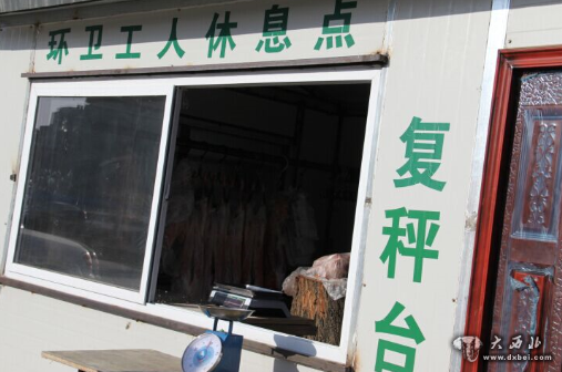 一位在此居住的居民告诉记者,“环卫工人休息点”这几个字是几天前刚贴上去的。