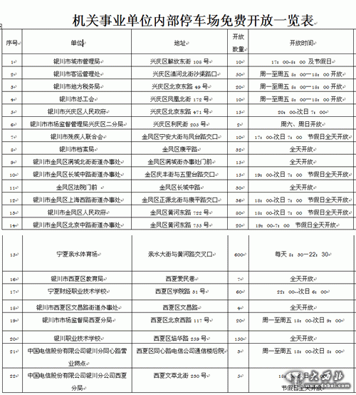 银川市政府本着“便民、利民、为民”的原则,鼓励和引导机关事业单位内部停车场位向社会提供免费开放服务,此次开放单位(集中办公点)22家,开放停车位1194个。这些停车场仅限小型客车(7座以下)的临时停放;社会车辆进出停车场,必须主动进行登记;必须在规定时间和指定的开放停车区域停放,不得占用单位留用车位;车主须自觉遵守停车场规定,做到文明停车,对不服从管理、影响单位正常工作的,工作人员有权拒绝对方的停车要求;停车人员如有损坏停车场设施的,须照价赔偿。