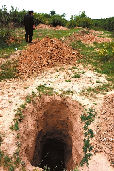 杨凤军介绍,虽然之前有盗墓发生,但数量不多。自退耕还林后,村民对山地不再耕种管理,前来探查的人越来越多,这些人白天踩点,晚上盗墓,盗洞大多没有回填,还有村民晚上偷着放牧时,羊只掉进盗洞的事发生。