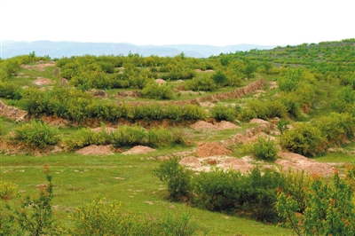 在村民带领下,记者前往明川村和骆驼村之间一处退耕还林地。这里的山地大多已退耕,经过多年封山禁牧,山上草木旺盛,田埂上的柠条有一人多高。站在山脚向上看,视线受草木遮挡,看不到盗墓痕迹。