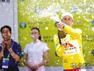 来自斯洛文尼亚艾德里亚莫贝尔车队的拉多斯拉夫·罗吉纳在喷香槟庆祝,他夺得水洞沟-银川赛段黄色领骑衫,并以46小时53分38秒的总成绩成为本届环湖赛个人总冠军。
