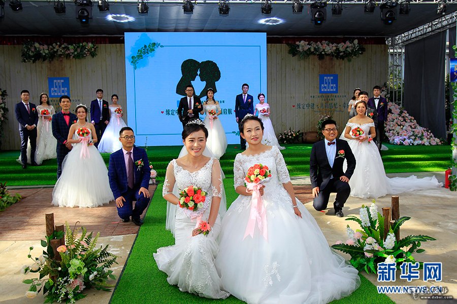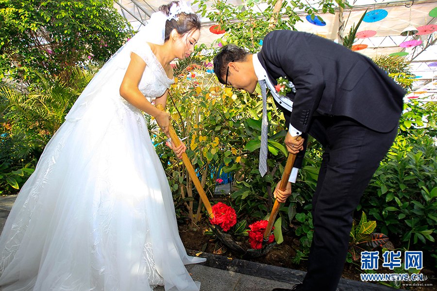 当日,中建三局集团有限公司银川分公司的9对新人在宁夏银川市金凤区森林海生态园举行集体婚礼,并在婚礼现场共植爱情树,分享喜悦,收获祝福。新华社记者隋先凯摄