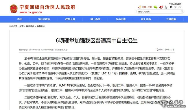 按照教育部有关要求,近期,自治区教育厅出台了6项举措进一步加强全区普通高中学校招生管理,下狠招切实整治自主招生中的一些乱象。除了取消“宏志班”“资助班”以外,严格执行“民族班”的招生政策,压缩部分“实验班”。在“艺术班”“体育班”的招生管理方面,各普通高中学校要充分发挥其办学特色,加强师资和课程建设,优化整合资源配置,更好地满足不同学生对教育教学的多样化需求,为培养学生的艺术、体育素养提供更多的选修课程。已开办“国际班”的普通高中学校,要严格按照《宁夏回族自治区教育厅普通高中国际班管理办法(试行)》的要求,充分发挥“国际班”在引进国际教育先进理念和资源、创新人才培养模式、培养国际竞争人才的优势,不断改进办学理念,严禁以“国际班”名义招生的学生转入普通班学习。