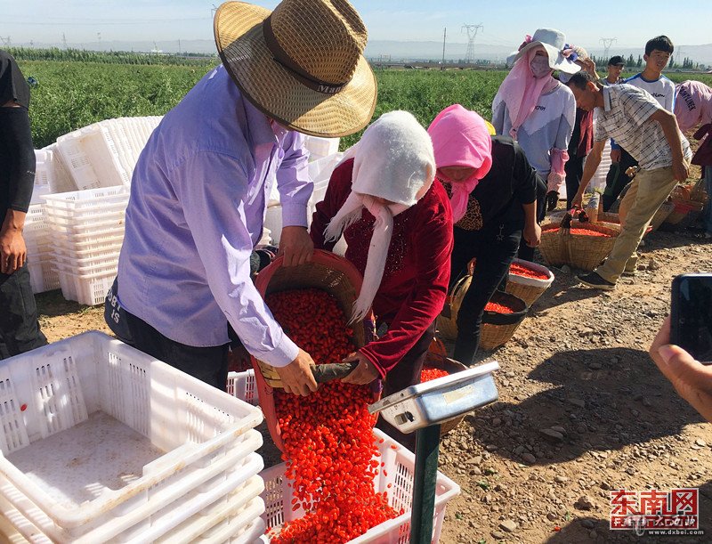 东南网7月8日宁夏专电(本网特派记者 颜财斌)一张桌子前放着一台秤,农民们提着刚采摘下来的新鲜红枸杞,排成长队等待过秤。在这里,每采摘一斤枸杞,农户可以领取1.2元。