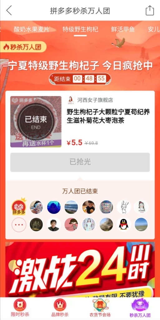 △拼多多“农货节”,2万单宁夏枸杞一天内售罄。20日零点,甲鱼与零食两个全网超高性价比的新秒杀万人团将启动,目前已各有超过6万人想买。
