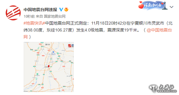 中国地震台网正式测定:11月18日20时42分在宁夏银川市灵武市(北纬38.00度,东经106.27度)发生4.0级地震,震源深度19千米。